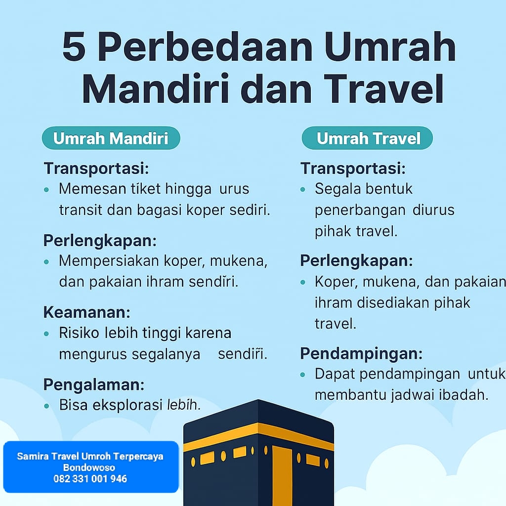 Belakangan ini, banyak yang tergoda mencoba umroh mandiri karena terlihat lebih murah dan fleksibel. Tapi sebelum memutuskan, yuk pahami dulu perbandingannya dengan umroh menggunakan Travel Umroh Bondowoso yang sudah berizin resmi.