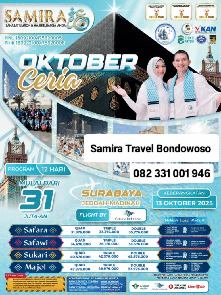Jadi, kini kamu sudah tahu bahwa biaya umroh 2025 bersama Samira Travel Bondowoso sangatlah bersahabat, dengan pelayanan amanah dan fasilitas terbaik.